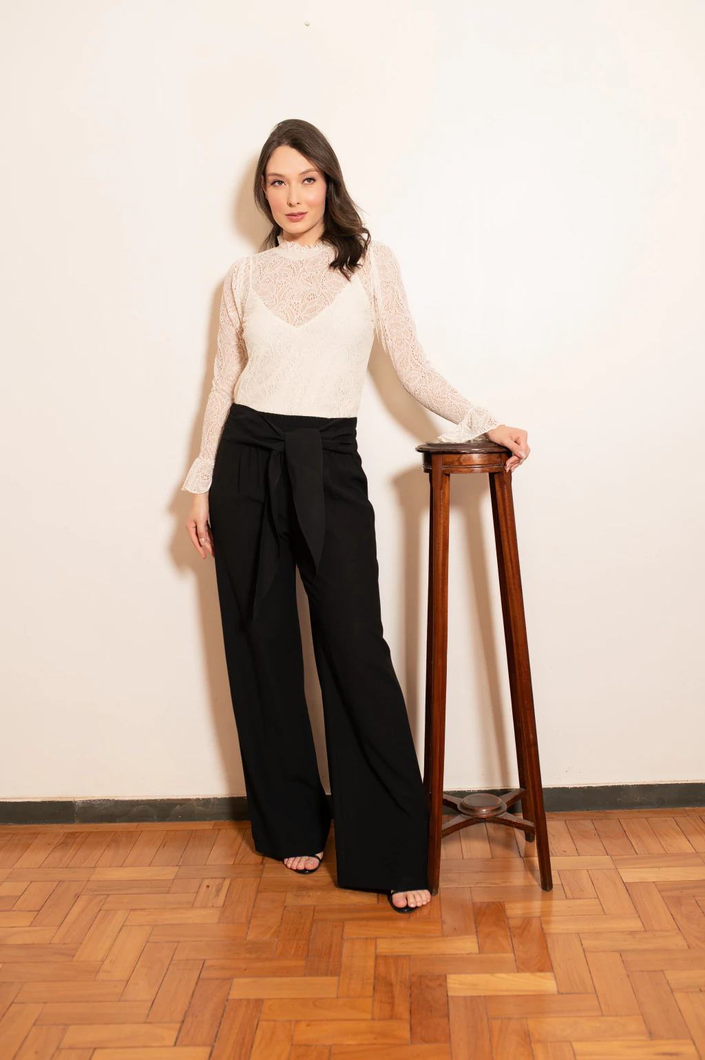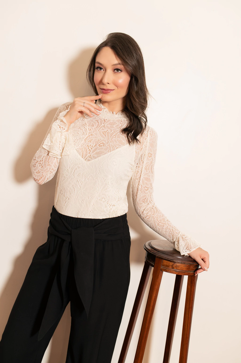 Esta blusa em renda off white possui uma gola levemente alta em renda franzida, mangas longas e um delicado babado no punho, trazendo um toque romântico ao seu visual.